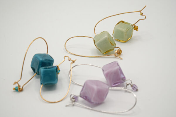 Two-tone necklace made with a blown part and on the opposite side, square pearls of various colors in paste.
