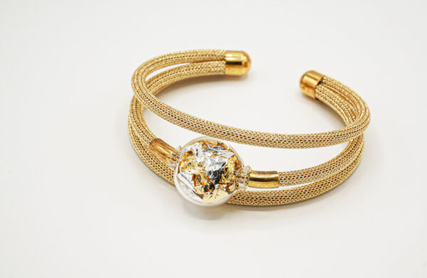 Spectacular bracelet made of Kevlar and with a glass pearl inside which a 24-karat gold leaf and a silver leaf have been inserted.